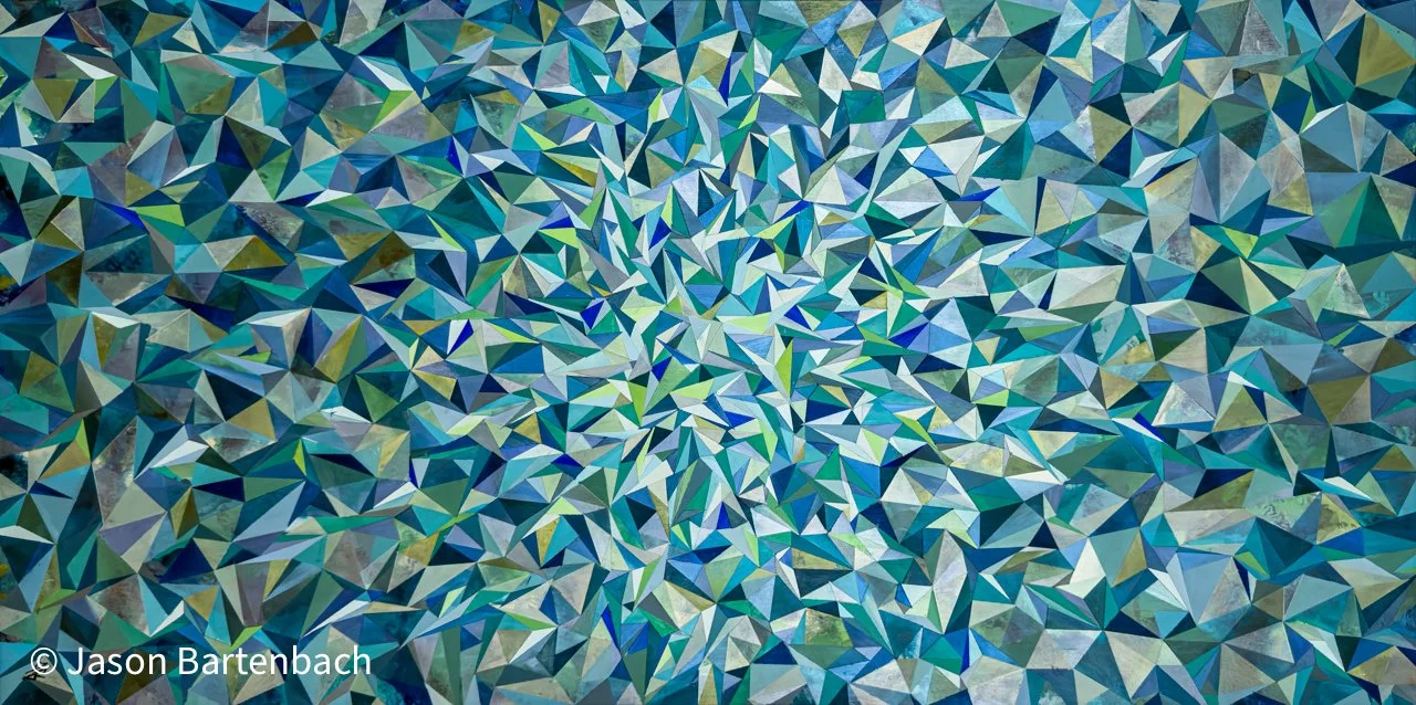 This series invites the viewer to look upward from beneath the offshore depths, where light breaks the surface in shifting, prismatic fragments. The pixelated triangles echo the strength and geometry of the ocean itself—a form both enduring and dynamic. Through these shapes, the paintings capture the ocean’s dual nature: its serene beauty and its immense, commanding power.